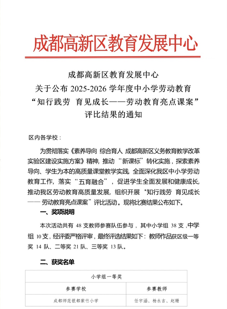 近日,成都师范银都紫竹小学一年级劳动教育课案《巧手“慧”整理,乐享“序”童年》在成都高新区2025-2026学年度劳动教育“知行践劳 育见成长——劳动教育亮点课案”赛事中脱颖而出,荣获一等奖!该课案由任宇涵、赵珊、杨永吉三位老师共同设计并组织实施,体现了学校劳动教育团队的协作智慧与专业创新。